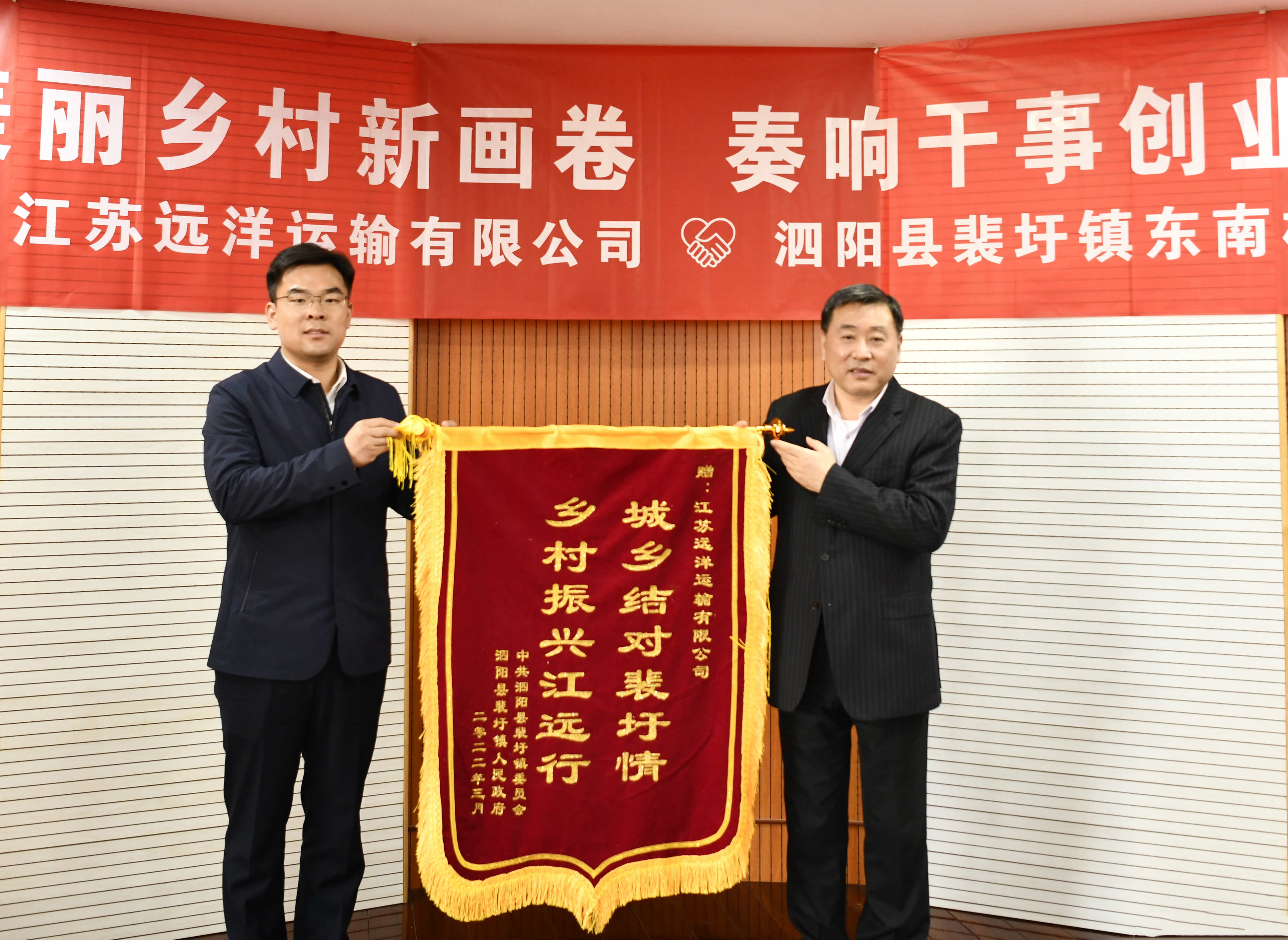 3月10日,泗陽縣裴圩鎮(zhèn)黨委副書記、鎮(zhèn)長張弛,省委駐泗陽縣幫促工作隊(duì)隊(duì)員、裴圩鎮(zhèn)東南村第一書記管俊俊一行,赴江蘇遠(yuǎn)洋座談交流并為公司贈(zèng)送“城鄉(xiāng)結(jié)對裴圩情,鄉(xiāng)村振興江遠(yuǎn)行”錦旗。公司黨委書記、董事長晁陽接受錦旗并參加座談,公司黨委副書記郭玉高,黨委組織部(人力資源部)、紀(jì)律監(jiān)督室、辦公室(董事會(huì)辦公室)相關(guān)負(fù)責(zé)人參加座談。