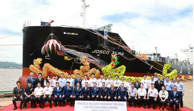 6月28日,江蘇遠(yuǎn)洋投資建造的1100箱位新型節(jié)能環(huán)保集裝箱船“江遠(yuǎn)遠(yuǎn)誠(chéng)”輪在舟山常石船廠命名交付。南京市交通運(yùn)輸綜合執(zhí)法監(jiān)督局五支隊(duì)支隊(duì)長(zhǎng)閆冰、副支隊(duì)長(zhǎng)潘新保,江蘇省港口集團(tuán)黨委組織部副部長(zhǎng)魯運(yùn)生、群眾工作部副部長(zhǎng)蔡正融,江蘇遠(yuǎn)洋黨委書記、董事長(zhǎng)晁陽(yáng),總經(jīng)理、黨委副書記戴偉,省港口集團(tuán)集裝箱公司副總經(jīng)理潘元兵,集團(tuán)航運(yùn)事業(yè)部副部長(zhǎng)劉冰,常石集團(tuán)(舟山)造船有限公司總經(jīng)理佐藤二郎、常務(wù)副總經(jīng)理村上佳史出席命名交付儀式。