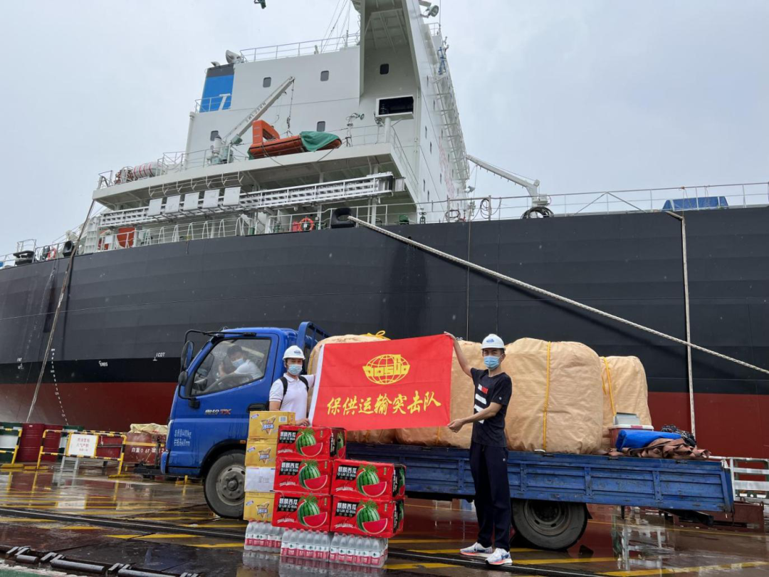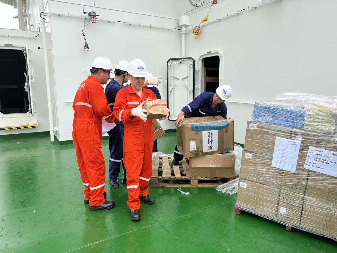 副總經(jīng)理潘良杰帶隊(duì)與供船部經(jīng)理郭慶一道,指揮調(diào)度物料供給全程。