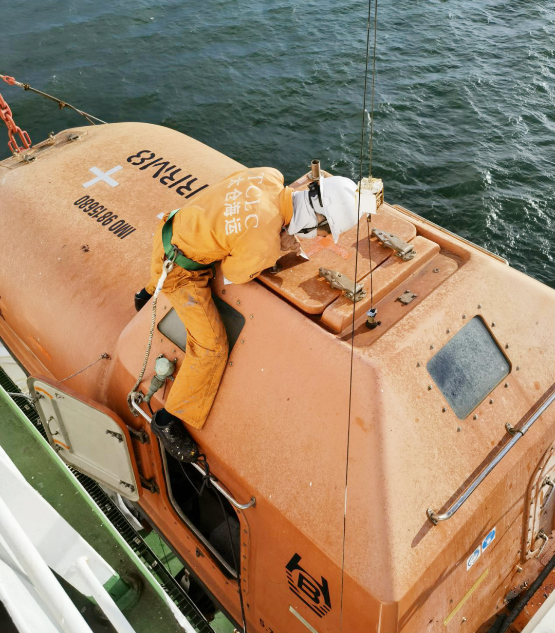 錨泊期間,更新救生艇反光帶。佩戴好安全帶、防暑面罩。