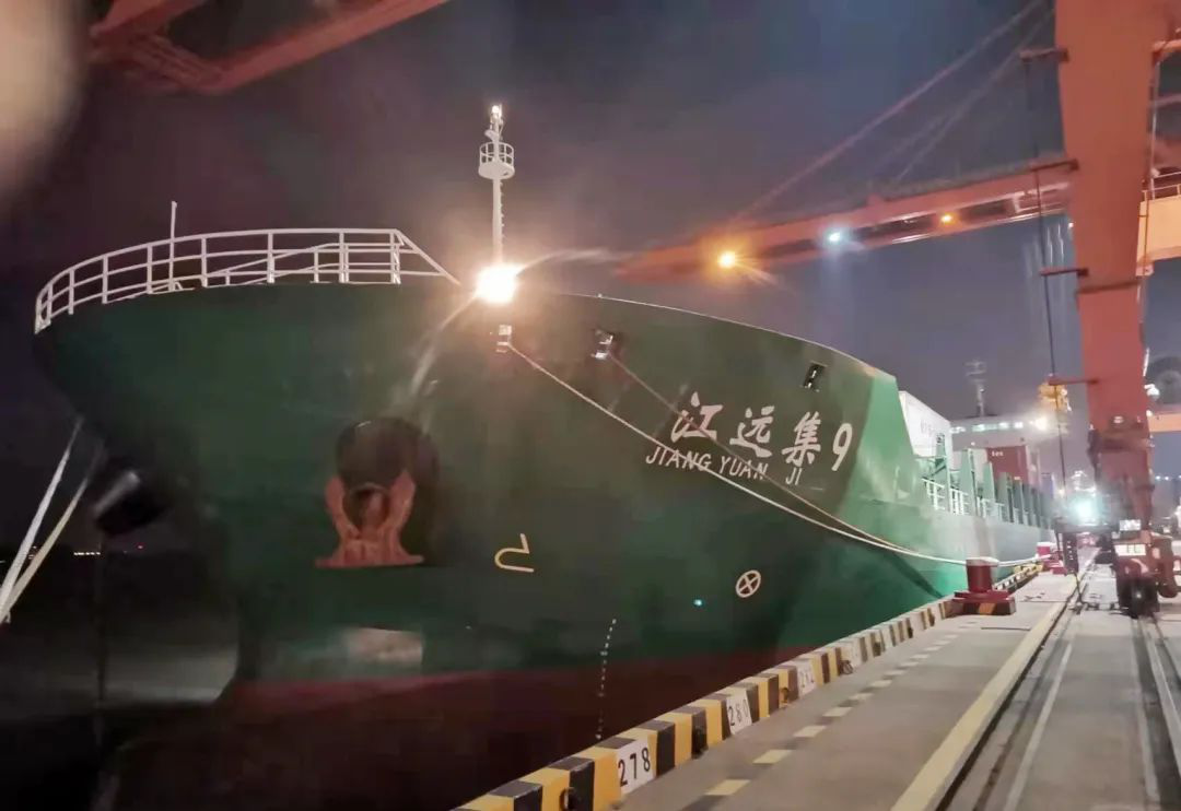 “江遠(yuǎn)集9”輪,總長158米、船寬24.7米、型深12.6米,載貨量22037噸、載箱量1258TEU。