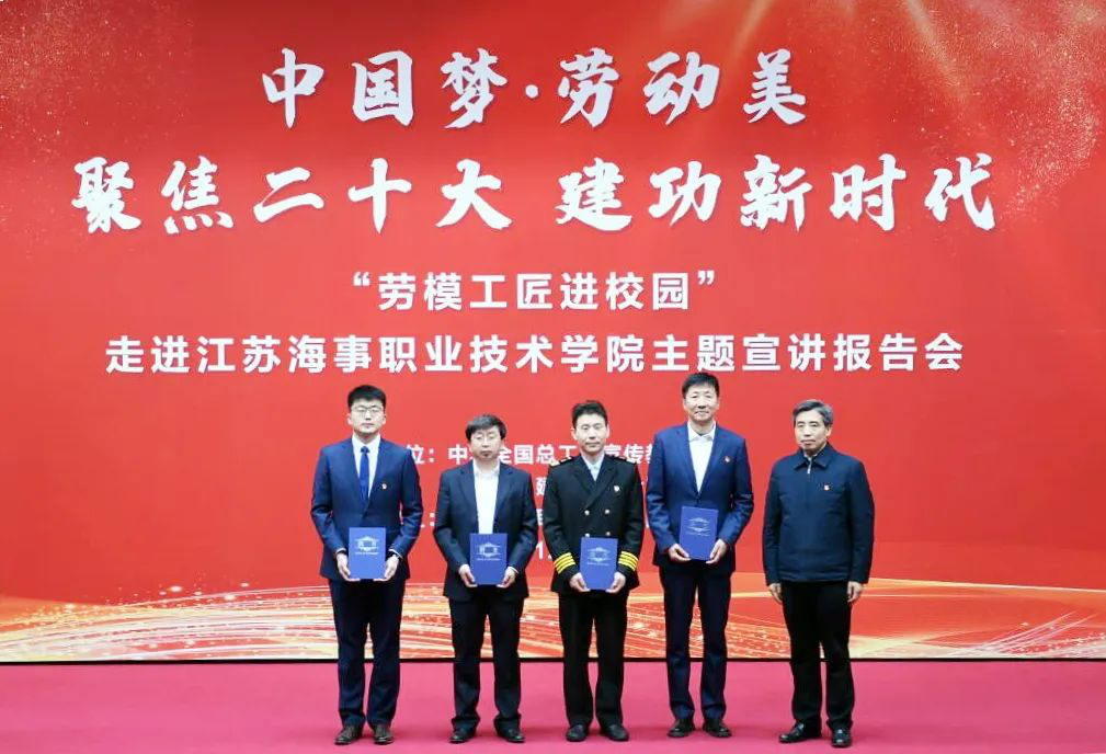 12月7日,江蘇遠洋船舶管理部明星船長褚震哲作為江蘇“最美交通人”、中國海事局“安全誠信船長”,與南京港龍?zhí)都b箱公司岸橋司機闞虎等4名勞模工匠一道,受邀參加由中華全國總工會宣傳教育部、中國海員建設工會全國委員會主辦的“中國夢·勞動美——聚焦二十大 建功新時代”勞模工匠進校園主題宣講報告會。中國海員建設工會副主席吳疆通過視頻參加活動并致辭,江蘇海事職業(yè)技術學院黨委書記劉紅明為活動致辭,學院黨委副書記王衛(wèi)兵主持報告會。