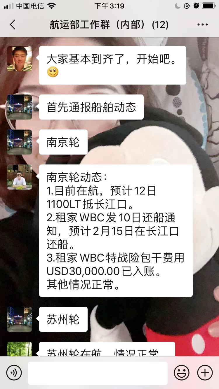 堅(jiān)持每天總結(jié)布置。即便是假期,航運(yùn)部負(fù)責(zé)人堅(jiān)持每天上午9時(shí)準(zhǔn)時(shí)通過(guò)微信工作群召開(kāi)工作總結(jié)布置會(huì)議,業(yè)務(wù)主管通報(bào)各國(guó)各地區(qū)各港口對(duì)來(lái)自中國(guó)港口船舶的檢驗(yàn)檢疫限制措施變動(dòng)信息,所管船舶動(dòng)態(tài)、員工個(gè)人健康狀況,并就實(shí)際問(wèn)題展開(kāi)交流。