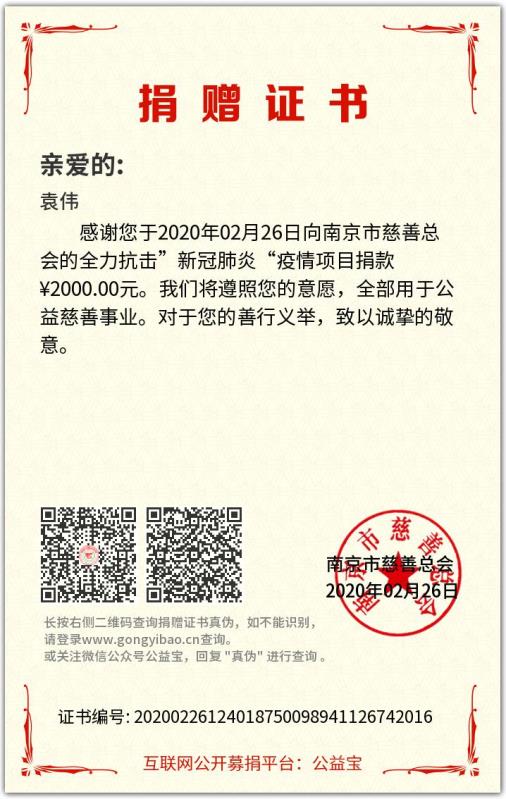 袁偉時刻關(guān)注著武漢的疫情防控一線信息,在防疫阻擊戰(zhàn)最艱巨的時刻,看到中國軍人、醫(yī)護(hù)人員逆行援鄂,他夜不能寐、深受鼓舞,毫不猶豫,自發(fā)向南京慈善總會捐助了2000元。“疫情無情人有情,只要我們精誠團(tuán)結(jié),就一定能勝利!”袁偉說:“我是一名共青團(tuán)員,更是入黨積極分子,只要國家需要、公司需要,我時刻準(zhǔn)備著。”