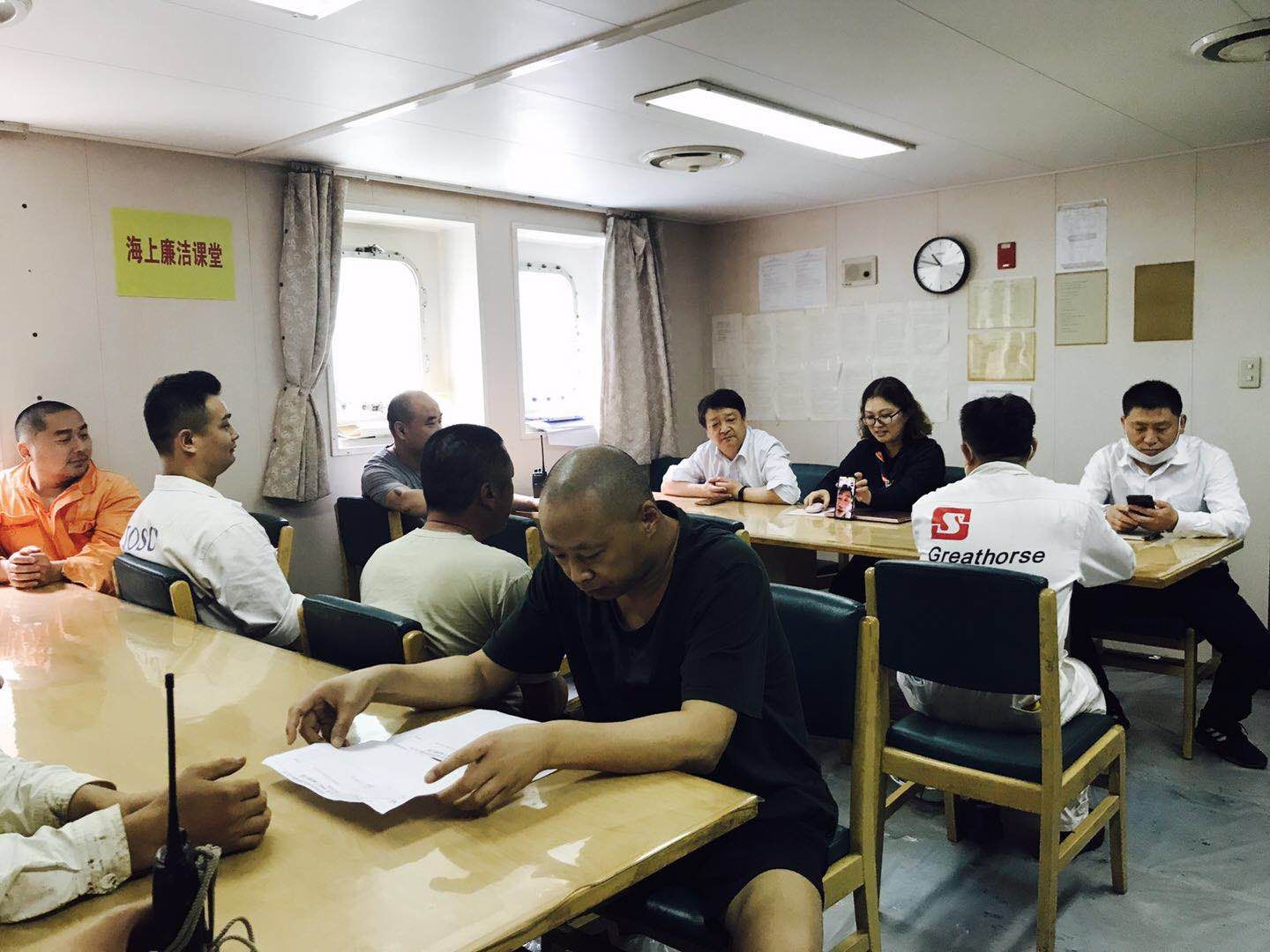 本次學(xué)習(xí)還特別視頻連線了公司黨委書記、董事長晁陽。晁書記親切問候了全體船員并肯定大家的努力與良好的精神面貌;提醒大家把工作重點(diǎn)放在“外防輸入,內(nèi)防反彈”上,進(jìn)一步加強(qiáng)遠(yuǎn)洋船舶疫情防控工作,做到疫情防控力度不減、勁頭不松;希望大家在特殊時(shí)期要同心同德,積極構(gòu)建船舶安全生產(chǎn)、疫情防控、班組建設(shè)三位一體格局。最后,晁書記祝愿全體船員工作順利。
