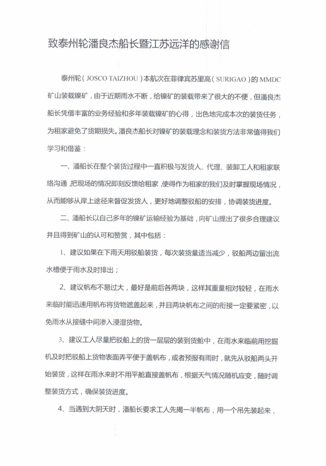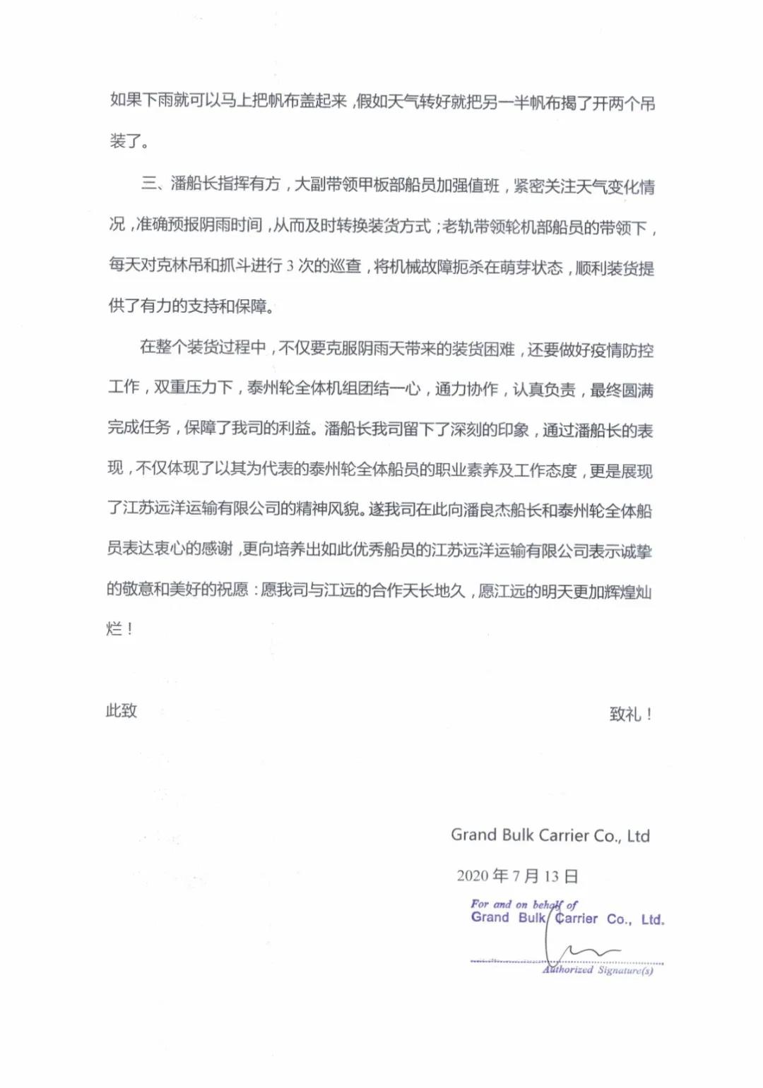 7月13日,江蘇遠洋航運部、“江遠泰州”輪同時收到租家GBC公司發(fā)來的感謝信。信中指出,泰州輪潘良杰船長有著“豐富的業(yè)務經(jīng)驗”、“指揮有方”,全體機組“團結(jié)一心,通力協(xié)作,認真負責”,“保障了我司的利益”、“我司留下深刻的印象”,對此表示“衷心的感謝”、“誠摯的敬意和美好的祝愿”。