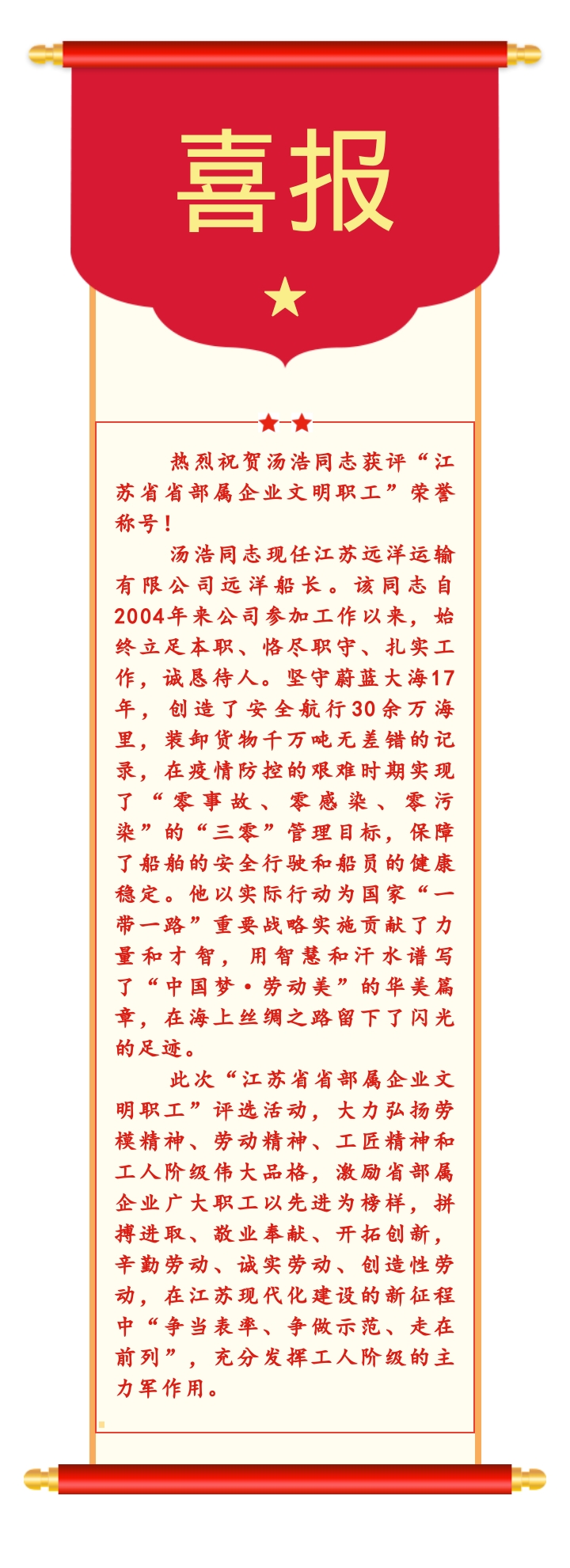 喜報 —— 湯浩船長獲評“江蘇省部屬企業(yè)文明職工”榮譽(yù)稱號