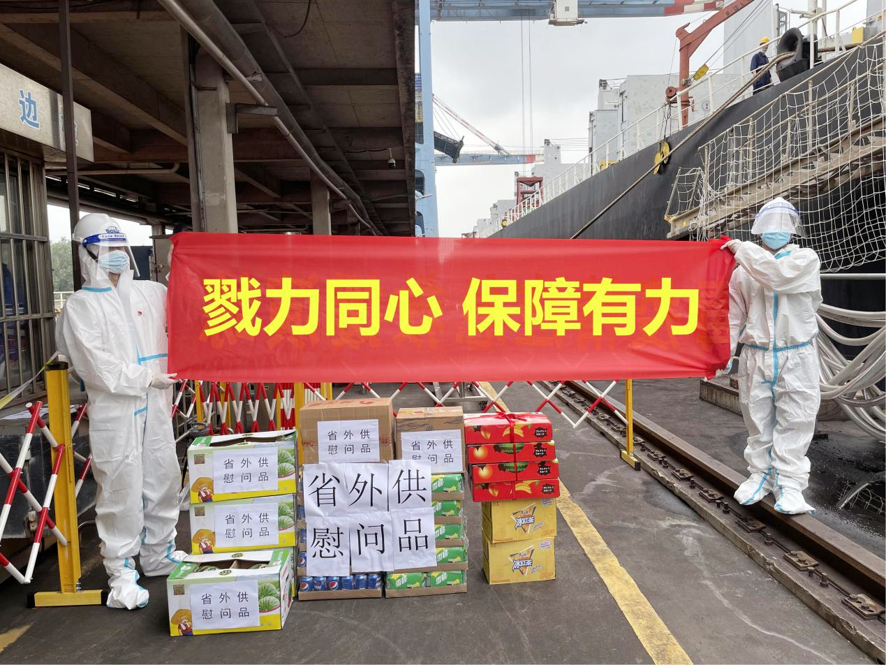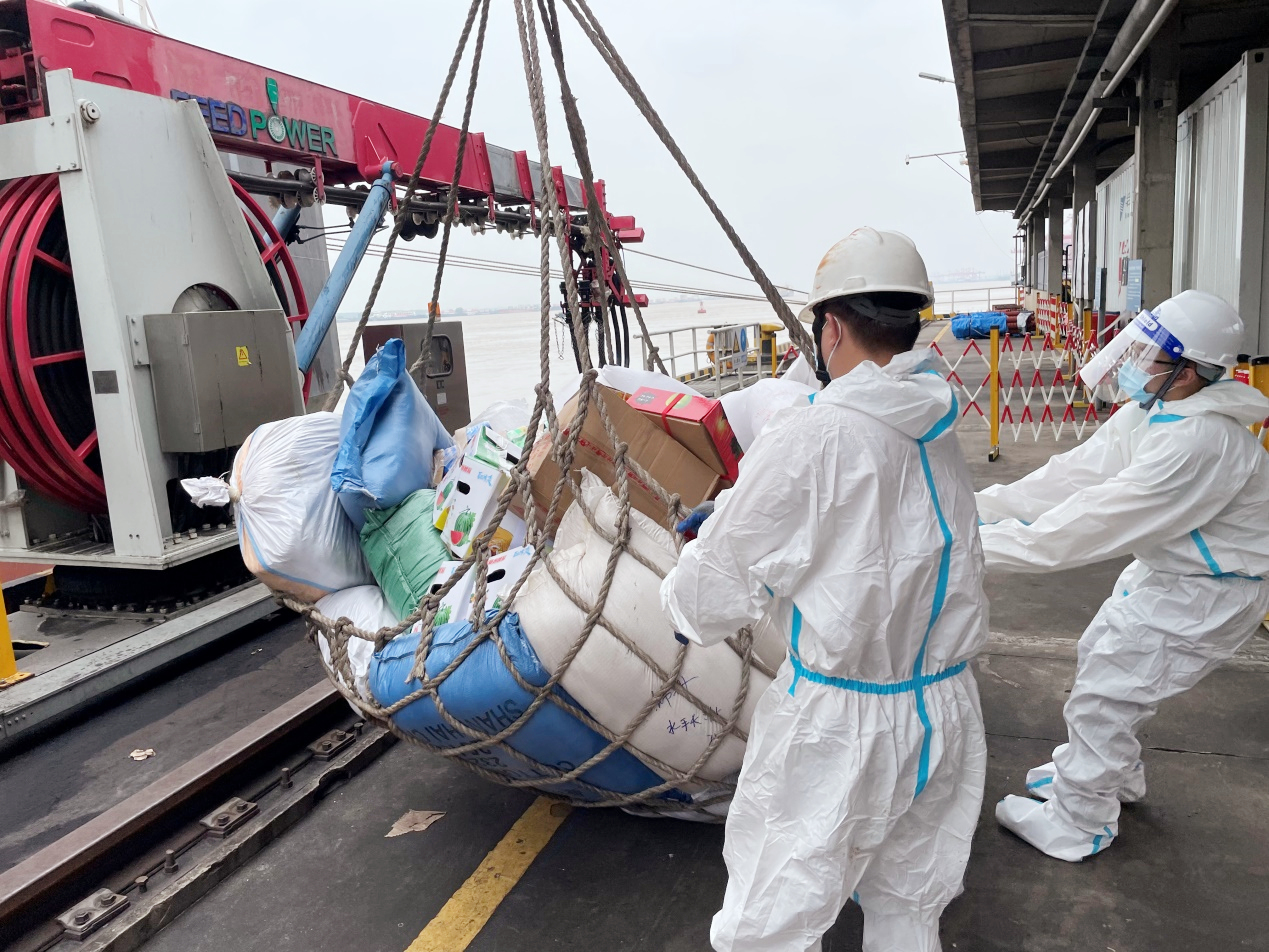 在黨員突擊隊(duì)帶領(lǐng)下,遠(yuǎn)洋外供人和港口其他工作人員一起將物資搬到船邊,汗水浸透了每一位隊(duì)員的防護(hù)服。他們來不及擦去汗水或是稍事歇息,放下貨趕緊按照省港口集團(tuán)制定的《江蘇港口口岸非登輪作業(yè)人員防護(hù)要求》,嚴(yán)格對供船物料和防疫物資進(jìn)行消殺。他們又在船員兄弟的協(xié)助下,按照全程“無接觸供貨”的疫情防控要求,將物資通過“小吊”吊上錦州輪,看著船員兄弟們笑呵呵地接下了這批物資,遠(yuǎn)洋外供人才舒了一口氣。錦州輪船長鄭恒進(jìn)站在甲板上向外供兄弟們不停揮手致意,表達(dá)了滿滿的謝意和贊許。