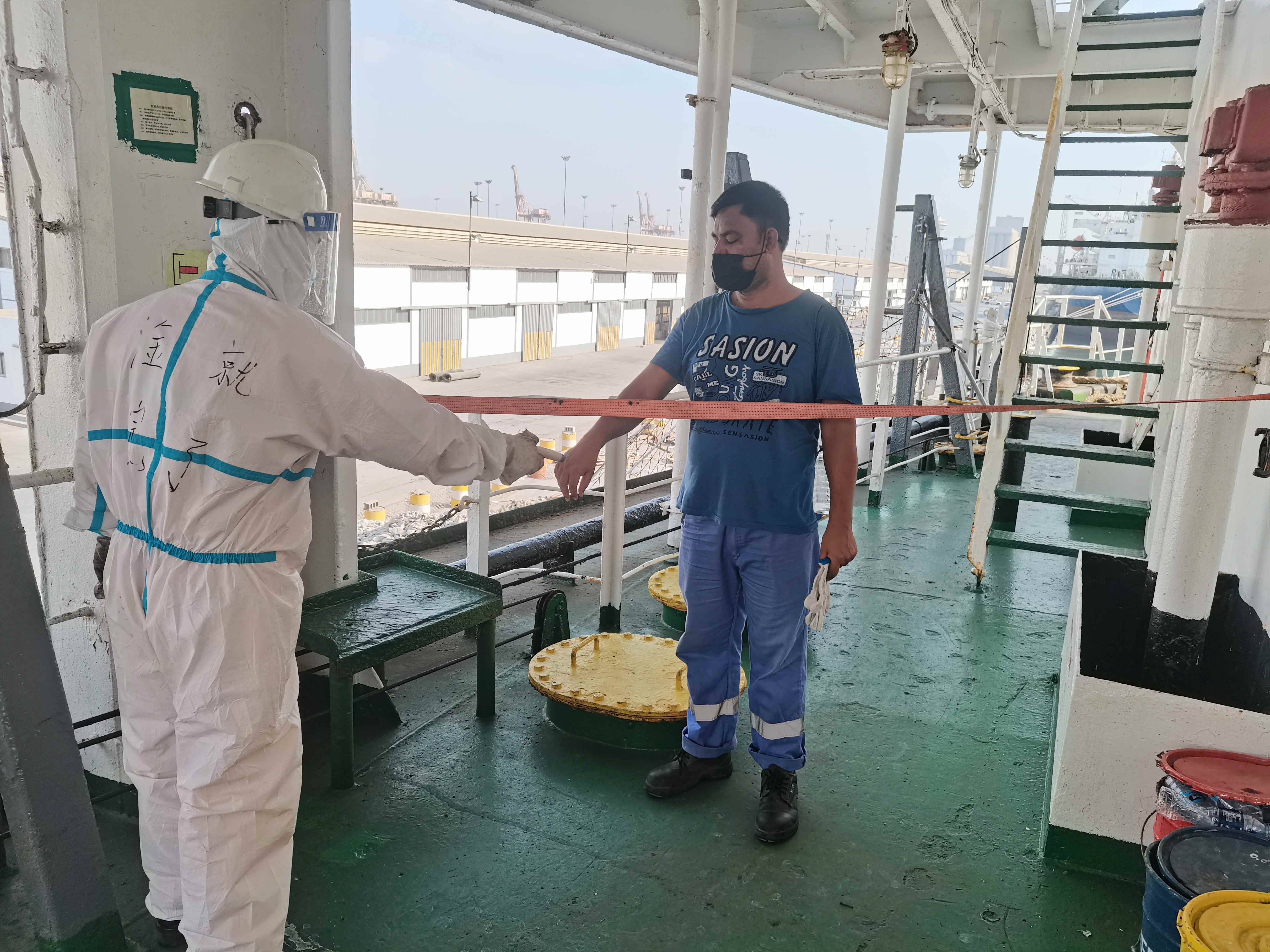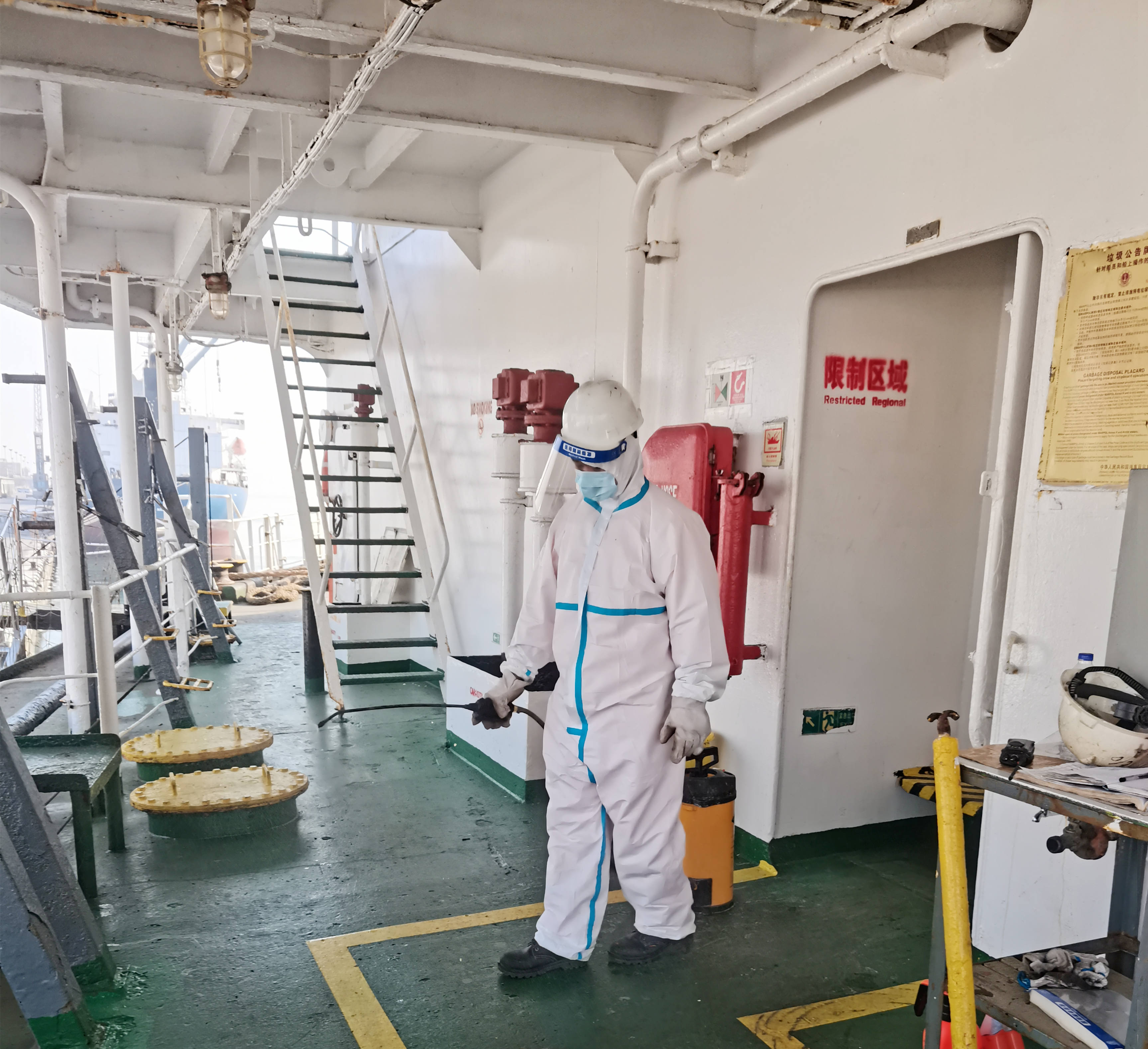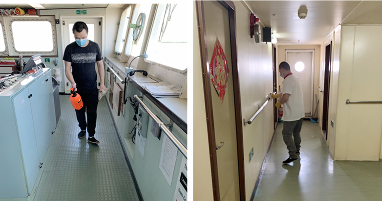 在關鍵細節(jié)上,大家更是容不得絲毫疏忽,如引航員、PSC官員等必須進入船舶工作、生活區(qū)域的,一定要測量體溫,確保正常后在船員引導下方可沿規(guī)定路線進入規(guī)定區(qū)域開展工作,并對其所經(jīng)過區(qū)域嚴格消殺,相關船員全程嚴密防護、保持安全距離。船員進入克令吊操縱室內(nèi),也要做好防護,并對操縱室每一個角落實施消殺,杜絕潛在的風險。