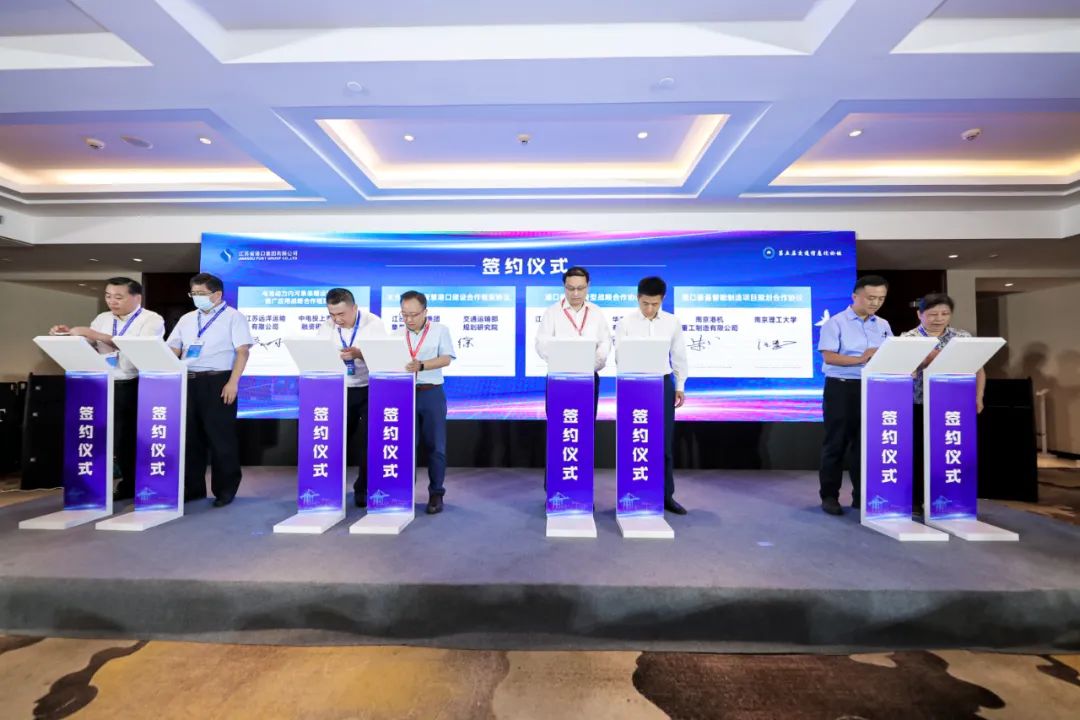 論壇上,江蘇省港口集團(tuán)與華為技術(shù)有限公司簽署港口數(shù)字化轉(zhuǎn)型戰(zhàn)略合作協(xié)議,江蘇省港口集團(tuán)集裝箱公司與交通運輸部規(guī)劃研究院簽署太倉港集裝箱智慧港口建設(shè)合作框架協(xié)議,江蘇遠(yuǎn)洋與中電投上海融和電科融資租賃有限公司簽署電池動力內(nèi)河集裝箱運輸舶船推廣應(yīng)用戰(zhàn)略合作框架協(xié)議,南京港機(jī)重工公司與南京理工大學(xué)簽署港口裝備智能制造項目規(guī)劃合作協(xié)議。