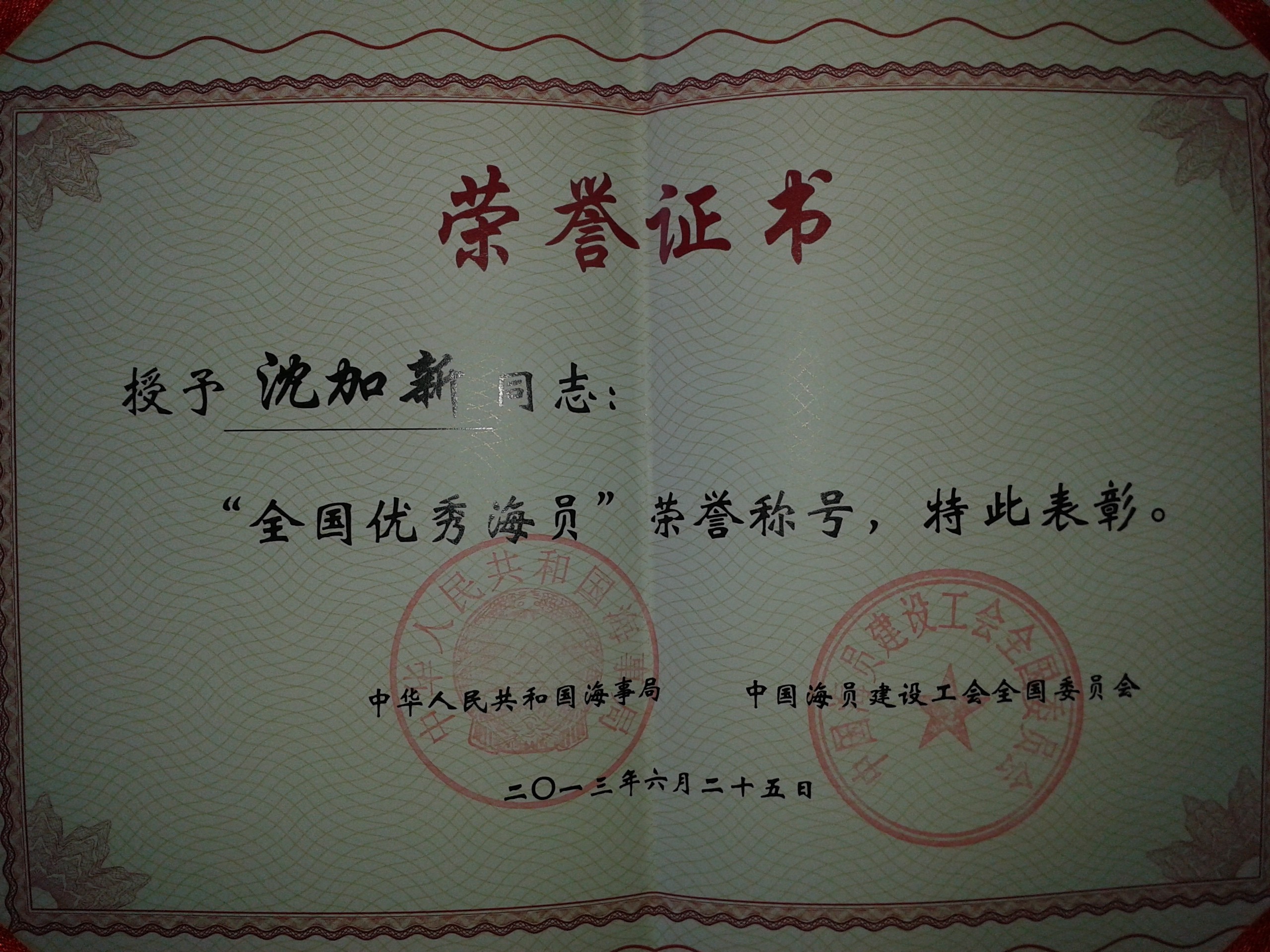 2013年6月沈加新同志被國家海事局中國海員建設工