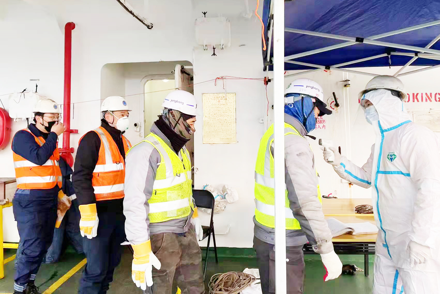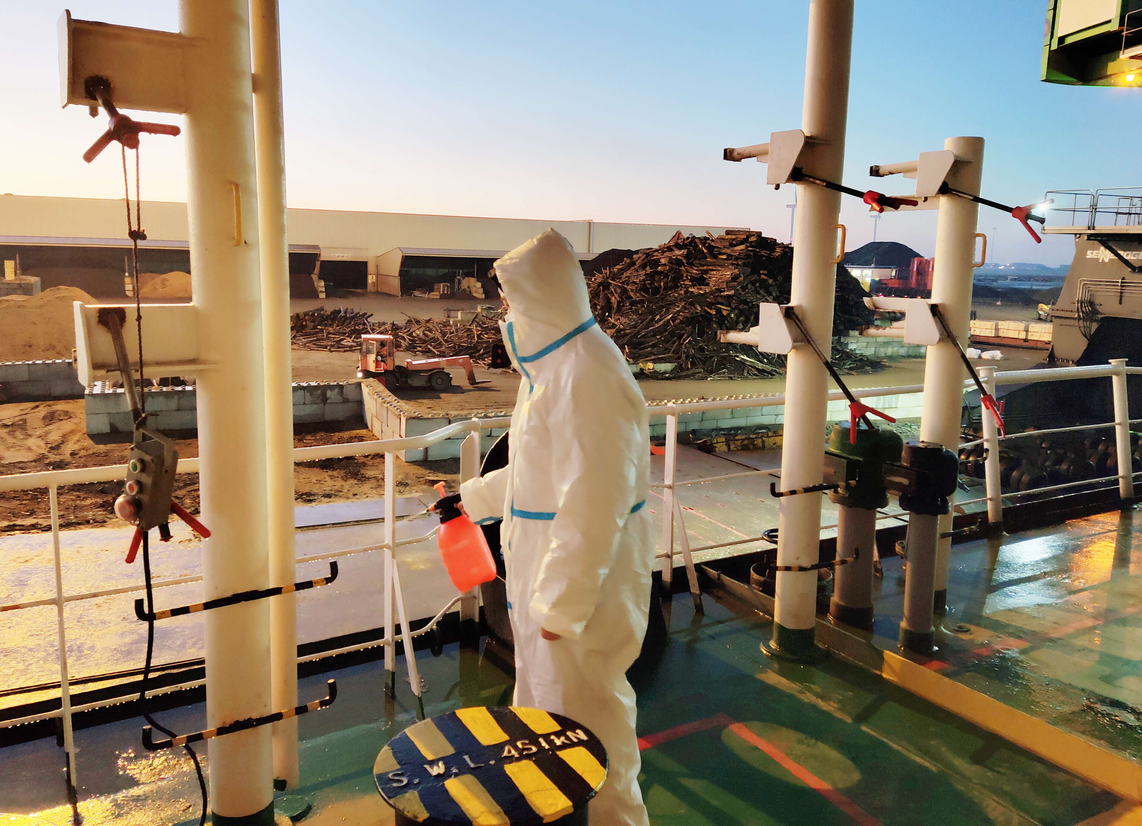 在韓國唐津港,“江遠(yuǎn)常州”輪船員身著防疫五件套,嚴(yán)格做好外來登輪人員的測溫和登記工作。