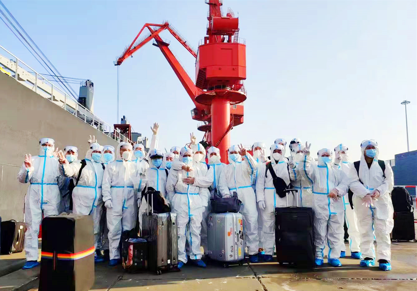 “江遠(yuǎn)貴州”輪交班船員在青島港集體留影。